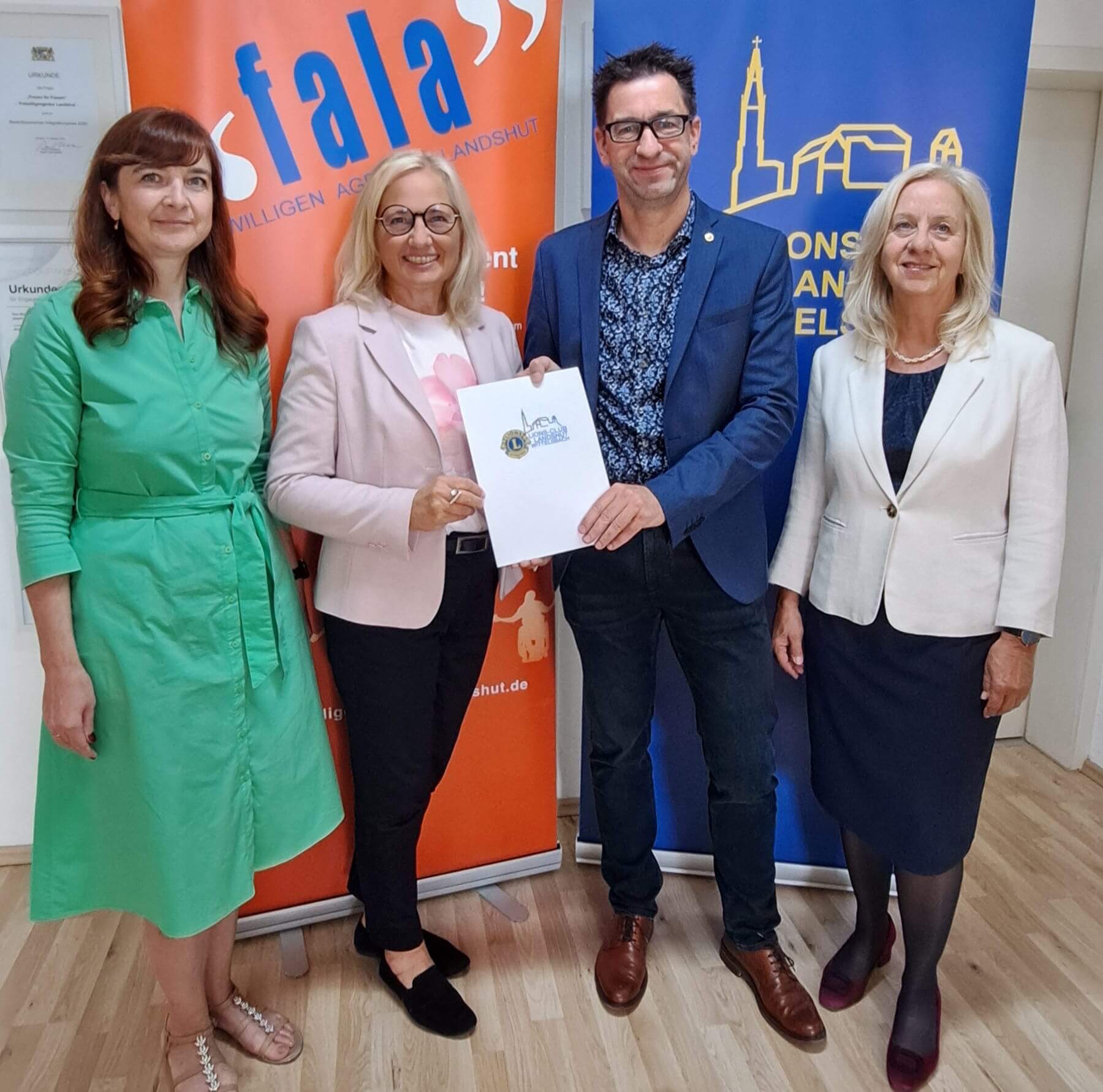 „Was hier vom Fala-Team und den vielen Ehrenamtlichen geleistet wird, ist wirklich beeindruckend“, sagte Tengler, Mit der Spende unterstützt der LIONS CLUB Landshut-Wittelsbach unter anderem die Integrationsarbeit, Die beiden Integrationslotsinnen Julia Haro (links) und Susanne Frank berichteten über ihre Ansätze, die Menschen mit Migrations- oder Fluchterfahrung durch eigenes Engagement zu wichtigen Brückenbauern in der Gesellschaft werden lassen. Fala-Geschäftsführerin Elisabeth-Maria Bauer (Zweite von links) bedankte sich herzlich beim LIONS CLUB Landshut-Wittelsbach für die wertvolle Unterstützung.